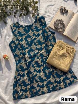 • Banarasi brocade cord set with short tunic and pant, perfect for festive wear and party occasions.