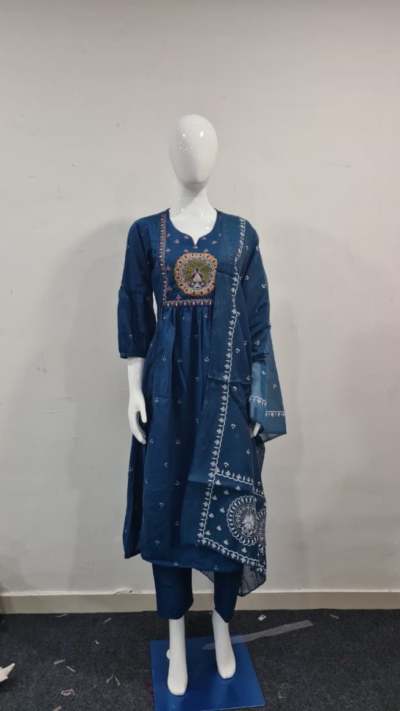Garments with dyed work may also consist of slight colour variations due to the manual dyeing process that it has undergone.